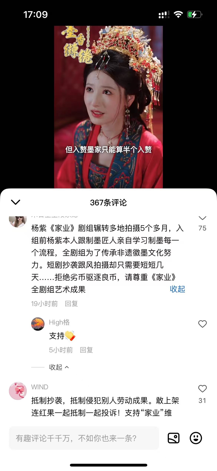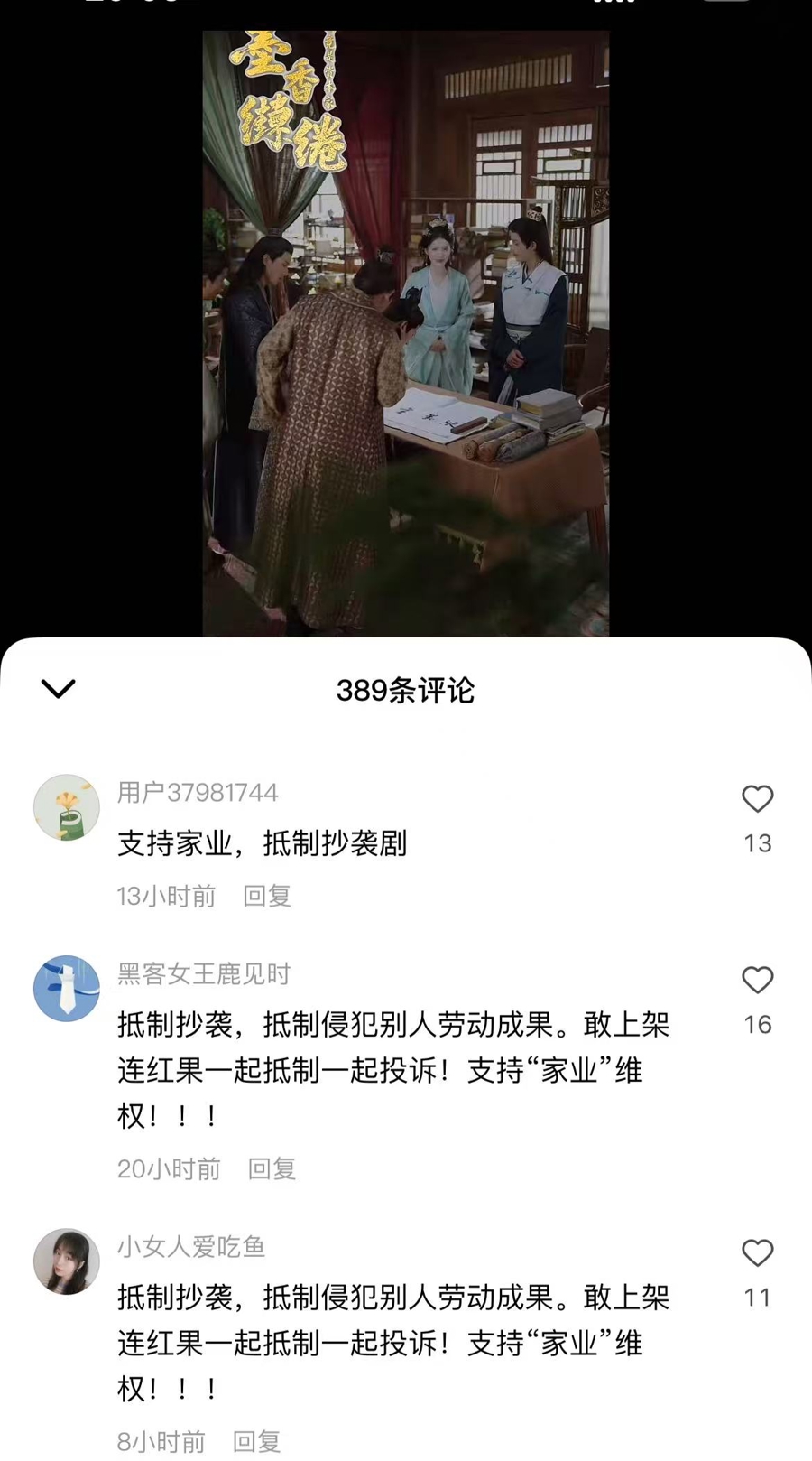 有网友发现,涉嫌侵权《家业》的短剧为竖屏剧《墨香缱绻,赘婿竟是资本家》,该剧不仅模仿制墨镜头,“合墨”“送八爷”等剧情场面也跟风拍摄。12月2日下午,记者检索发现,在竖屏剧《墨香缱绻,赘婿竟是资本家》预告片的评论区下方,观众纷纷表达了对《家业》剧组的支持以及对抄袭的抵制。有网友留言:“支持长剧短剧百花齐放,但坚决抵制抄袭。短剧虽追求流量,但绝不能以牺牲原创和底线为代价。原创是文化产业的灵魂,每一个被窃取的故事,都是在伤害行业根基。”
